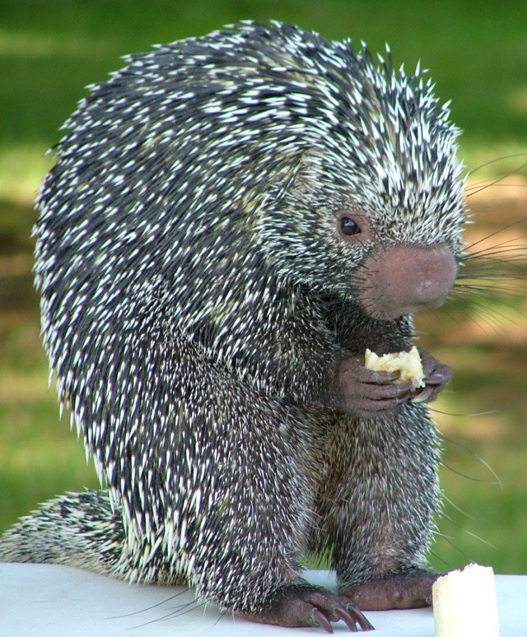 As a rule the female gives birth to a single young in the spring. The newborn porcupine is covered with red hairs and small spines, which harden shortly after birth.