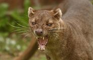 Fossas communicate using sounds, scents, and visual signals. Vocalizations include purring, a threatening call,[4] and a call of fear, consisting of "repeated loud, coarse inhalations and gasps of breath". A long, high yelp may function to attract other fossas. Females mew during mating and males produce a sigh when they have found a female. Throughout the year, animals produce long-lasting scent marks on rocks, trees, and the ground using glands in the anal region and on the chest. They also communicate using face and body expression, but the significance of these signals is uncertain. The animal is aggressive only during mating, and males in particular fight boldly. After a short fight, the loser flees and is followed by the winner for a short distance.[4]In captivity, fossas are usually not aggressive and sometimes even allow themselves to be stroked by a zookeeper, but adult males in particular may try to bite.