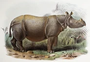 The Javan rhinoceros (Rhinoceros sondaicus), also known as the Sunda rhinoceros or lesser one-horned rhinoceros, is a critically endangered perissodactyl (odd-toed ungulate) species of the family Rhinocerotidae and part of the "true" rhino genus, with the Indian or greater-one horned rhinoceros (R. unicornis). Together, the genus Rhinoceros comprises two of the five extant rhinoceros species, all of which are endangered or threatened with extinction due to hunting and habitat loss. addition to the black rhinoceros (Diceros bicornis) and the white rhinoceros (Ceratotherium simum). and has similar mosaicked, armor-like skin, but at 3.1–3.2 m (10–10 ft) in length and 1.4–1.7 m (4.6–5.6 ft) in height, it is smaller (in fact, it is closer in size to the black rhinoceros of the genus Diceros). Its horn is usually less than 25 cm (9.8 in), smaller than those of the other rhino species. Only adult males have horns; females lack them altogether.